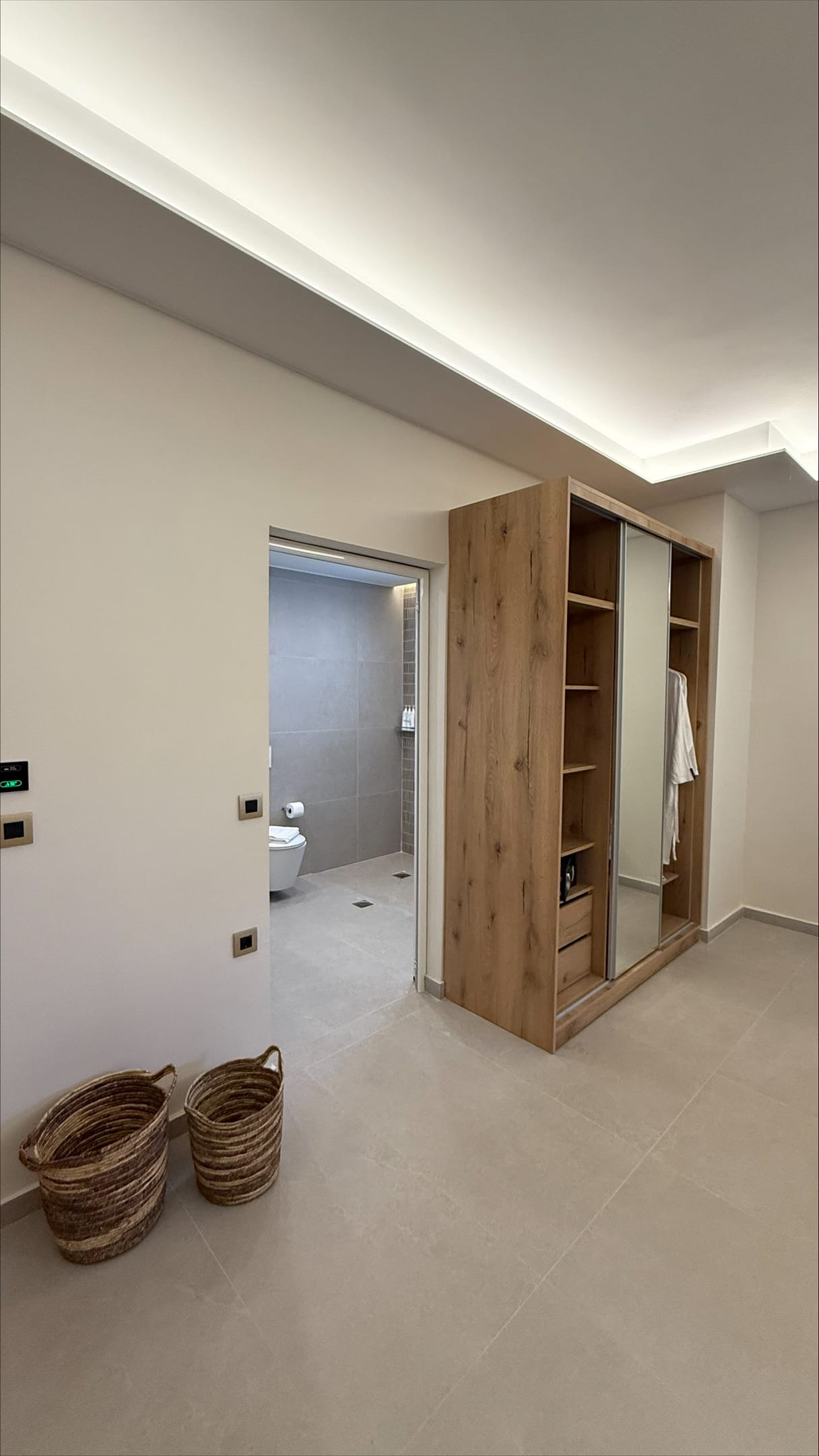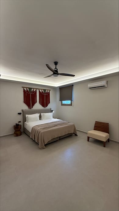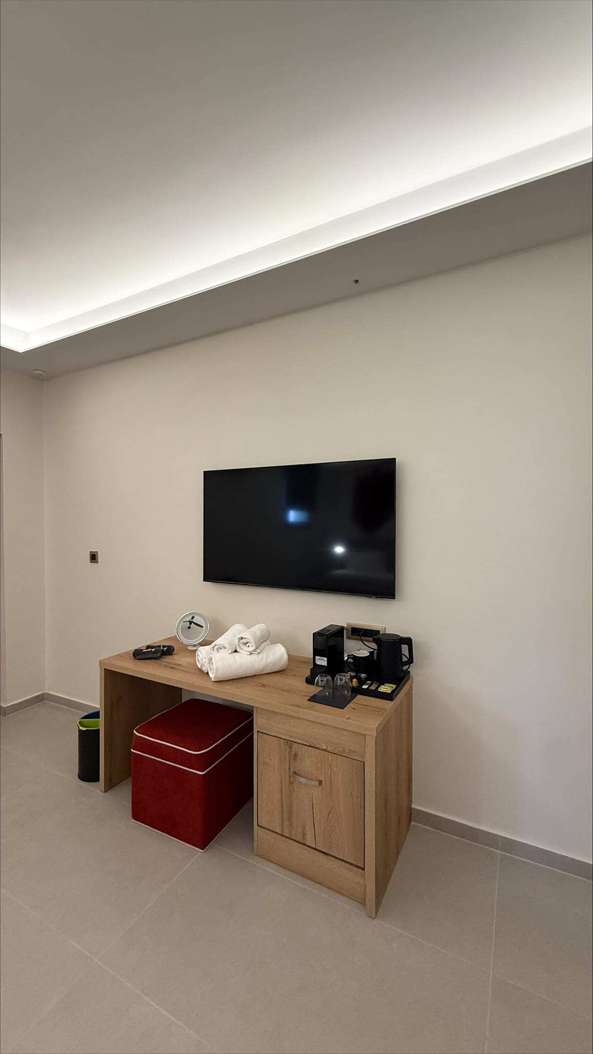 The room features a king-size bed with an anatomical eco-friendly mattress (200 x 180 x 32 cm) or twin beds❖ Suitable for 2 adults ❖ Smart Room ❖ King size bed with anatomical eco mattress (200 x 180 x 32) or twin beds ❖No balcony ❖ No view ❖ Individual air-conditioning/heating ❖ Wi-Fi ❖ Smart IP TV 55’ ❖ Safe Deposit Box ❖ Mini fridge ❖ Bathroom with Shower Cabin ❖ Bath eco-friendly premium amenities ❖ Hairdryer ❖ Iron/ironing board (on request) ❖ Security door with soundproofing, peephole, latch and stop for groom. ❖ Black-out curtains for complete blackout. ❖ Base for suitcase. ❖ Office furniture with ergonomic chair and appropriate lighting. ❖ Full-length mirror in the bedroom with appropriate lighting. ❖ Furniture on the balcony or terrace. ❖ Coffee machine espresso and Kettle ❖ Air conditioning - Alternative ways of regulation: via remote control, via wall-mounted control panel, via smartphone application. ❖ Ceiling fan for natural ventilation - cooling of the rooms without the use of an air conditioner. ❖ Smart switch ❖ Bathrobes ❖ Eco slippers ❖ Pool Towels ❖ USB and USB-C chargers on each side of the bed and on the desk. ❖ Eco friendly material separation bins